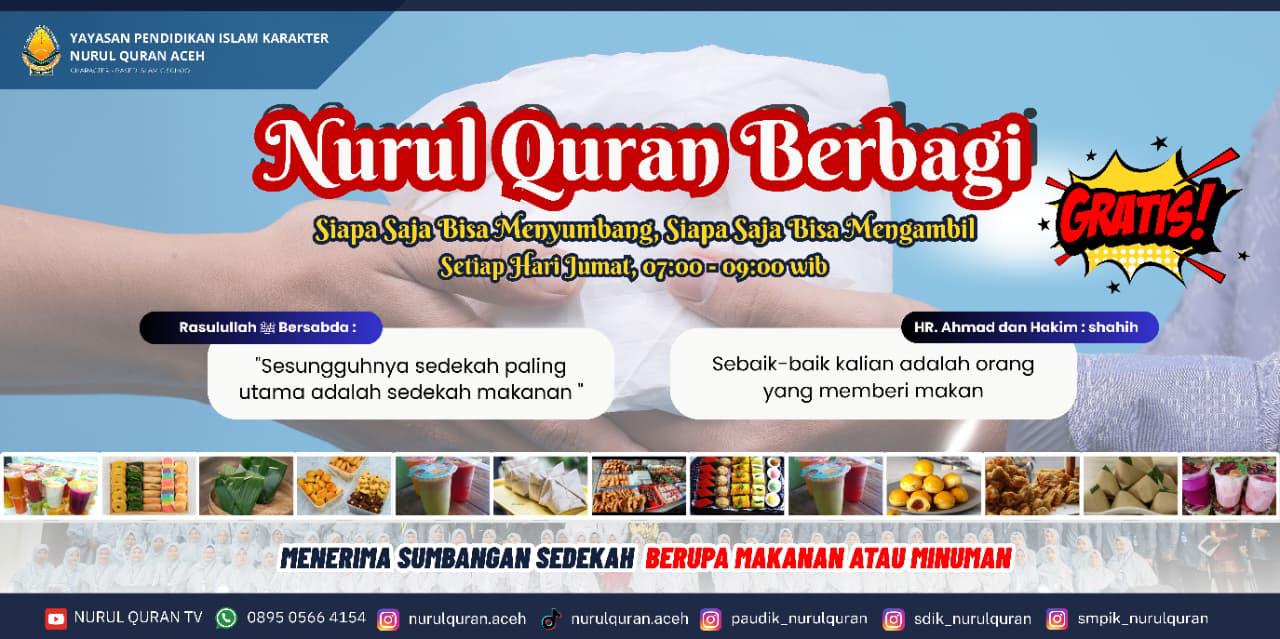 Ada pemandangan yang menarik saat melintasi Jalan Soekarno Hatta Kabupaten Aceh Besar, Provinsi Aceh, tepatnya di depan kompleks lingkungan Sekolah Nurul Quran. Terlihat sebuah booth sederhana dengan spanduk bertuliskan “Nurul Quran Berbagi – Sedekah Makanan Jumat.” Inilah program rutin berbagi makanan dan minuman gratis bagi siapa saja yang membutuhkan atau sekadar melintas di depan sekolah. Siapa pun boleh singgah dan mengambil makanan atau minuman sesuai kebutuhan, tanpa syarat apa pun.